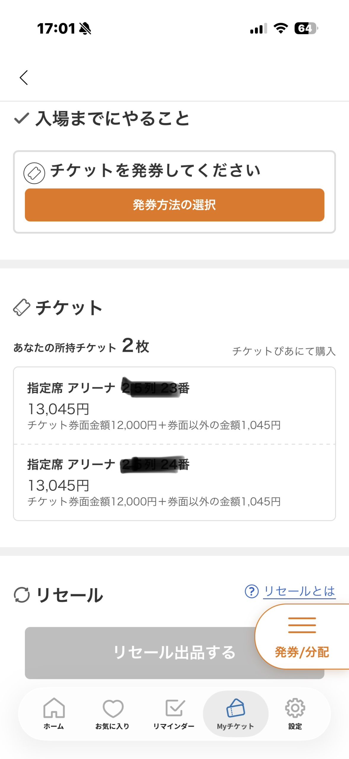 少し前に行った別のライブチケットの時はこのリセールボタンの存在すらなかったし、「リセールに出品する」がグレーにはなっているが存在はあるから、きっとリセールできるでしょう、と思っていました。